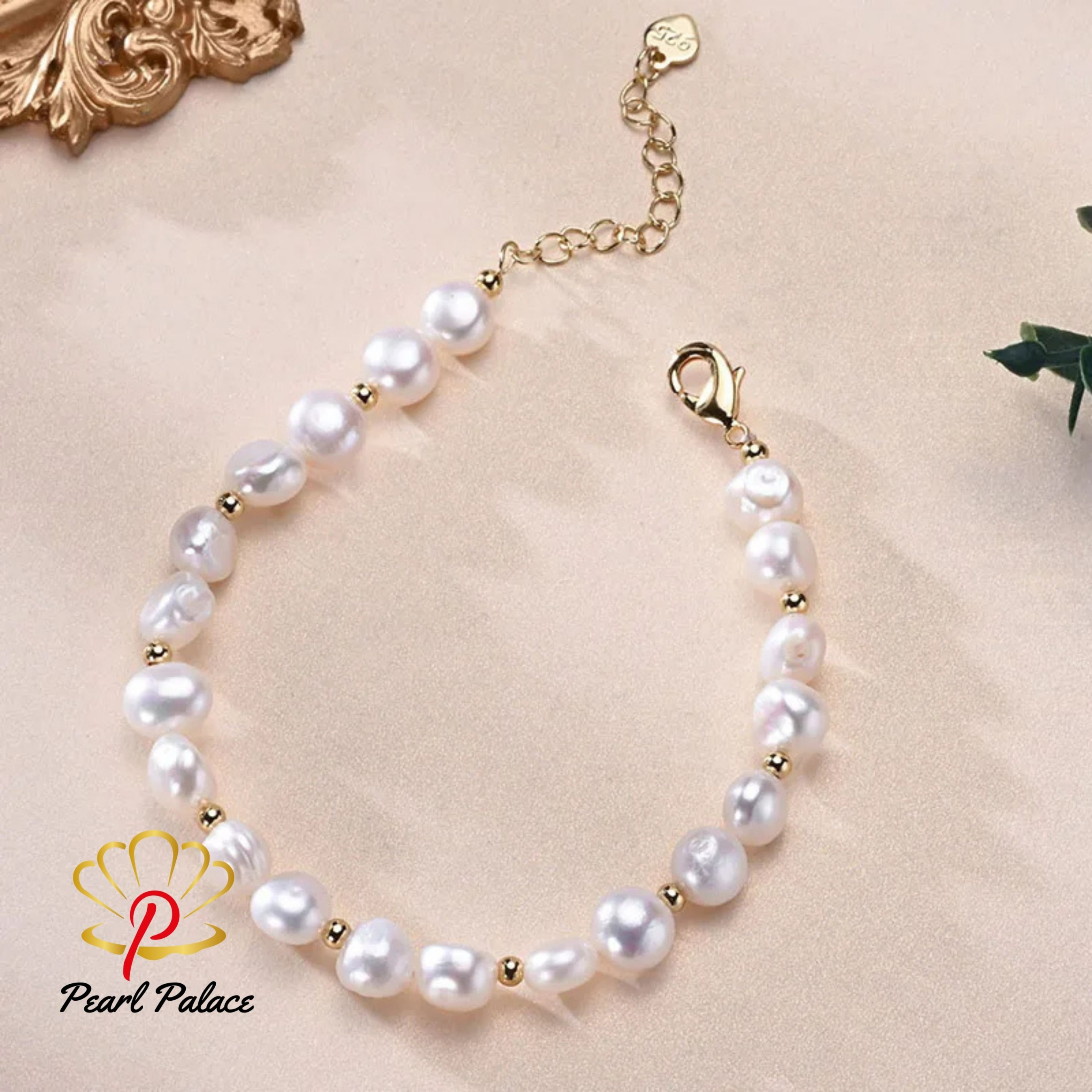 Baroque Freshwater 8-9mm White Pearl With Small Gold Bead Necklace 925 Sterling Silver Jewelry