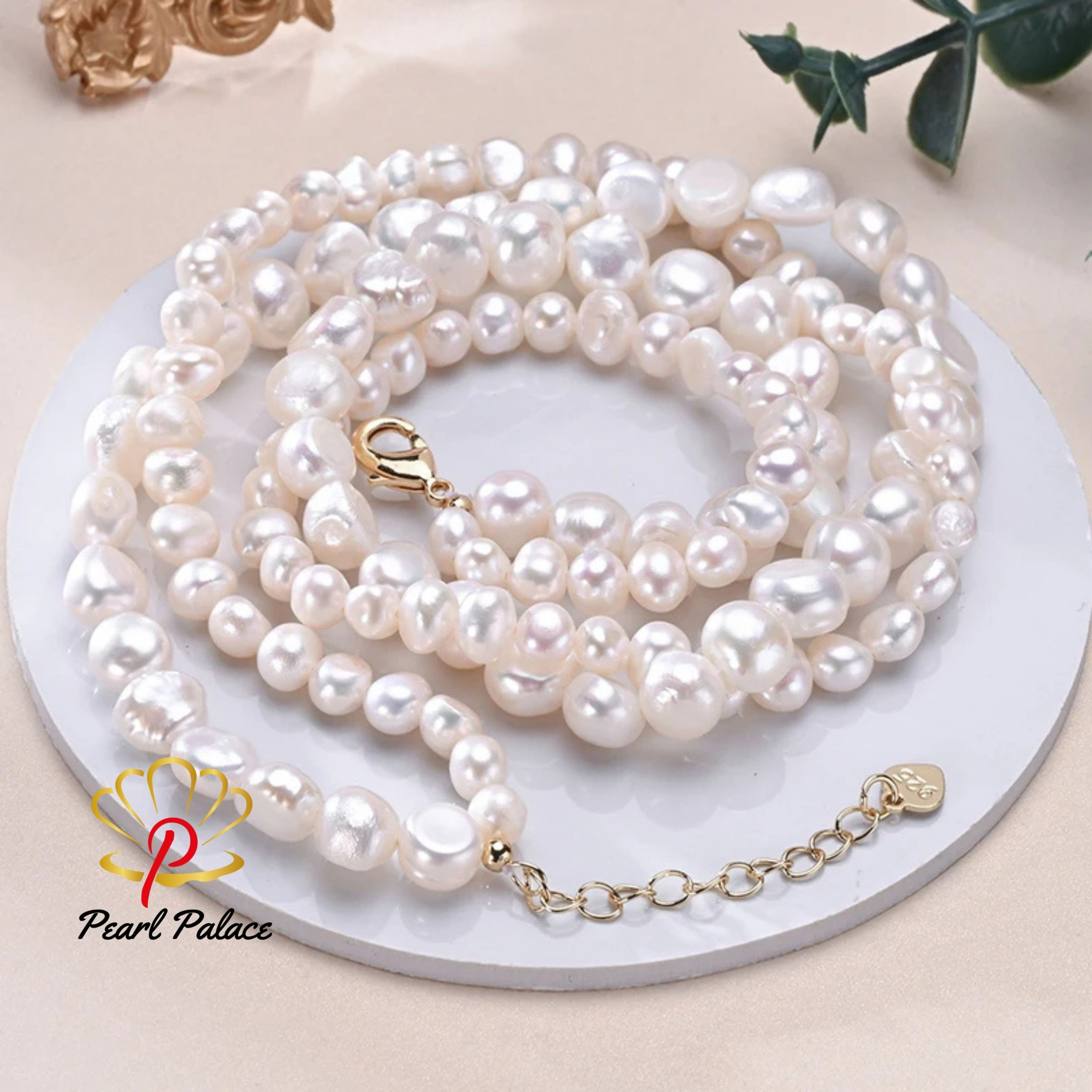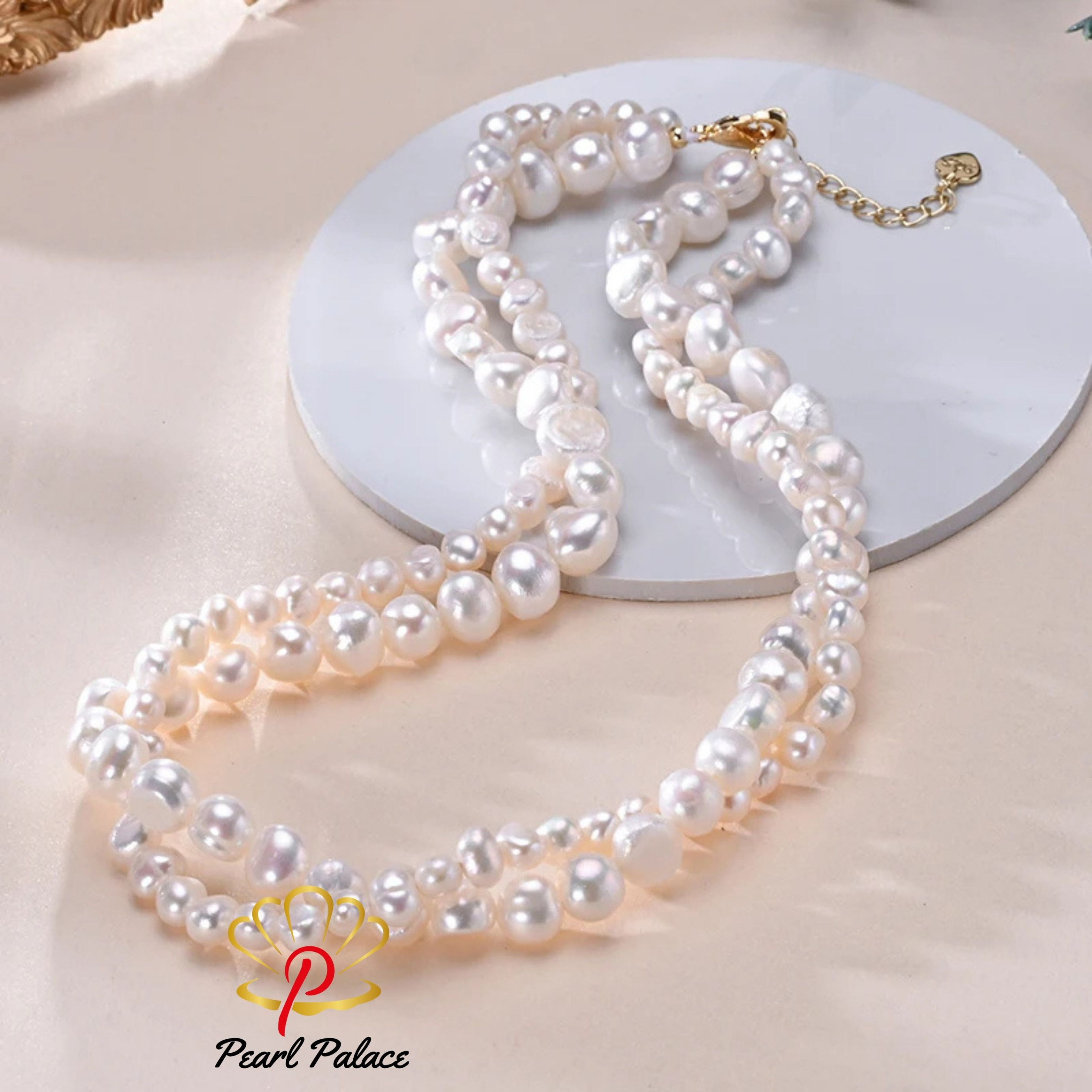 This trendy double-layer necklace showcases a stunning combination of baroque freshwater pearls in 5-6mm and 8-9mm sizes. Set in 925 sterling silver, it delivers a chic and modern look, perfect as a gift or accessory for any occasion.