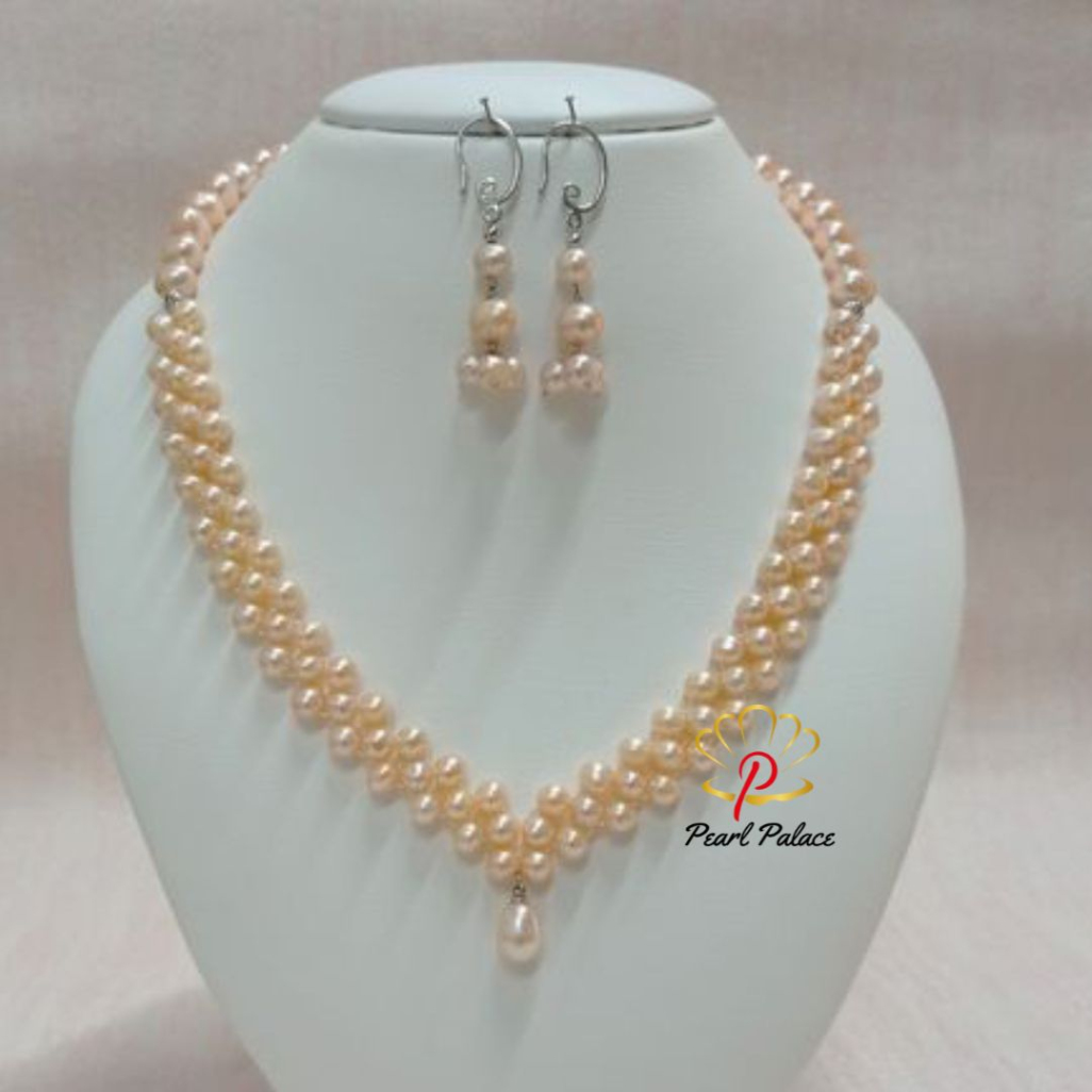 Product name: "Petal Weave" Pink Freshwater Pearl Necklace Set. Pearl Size: 7-8 mm Pearl Grade: AAA Pearl Length 17-18 Inch