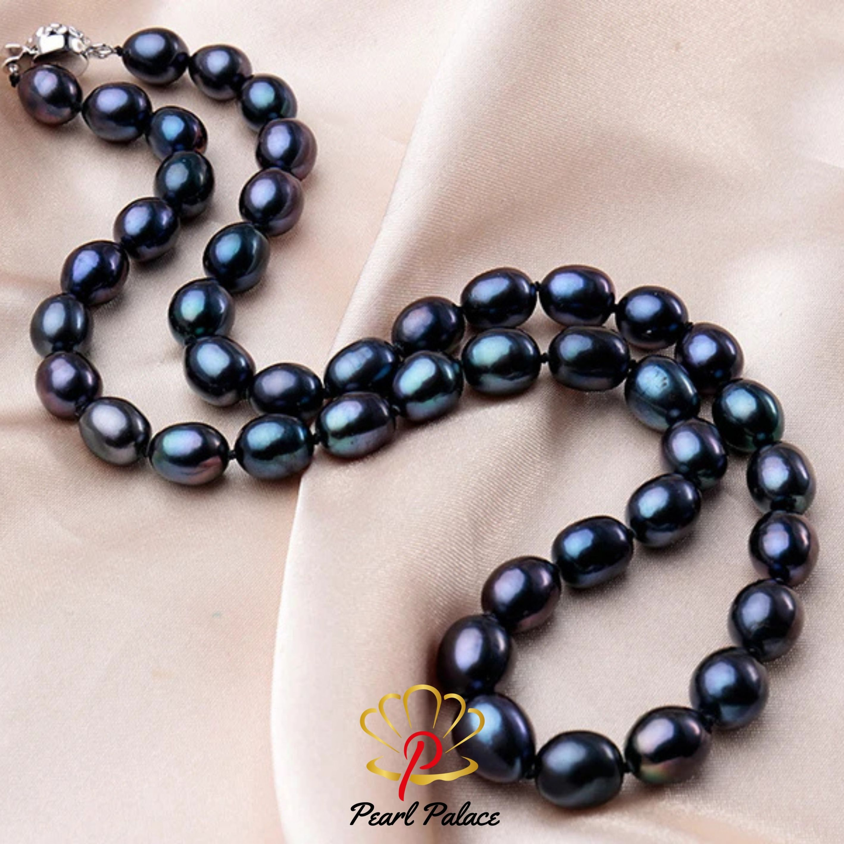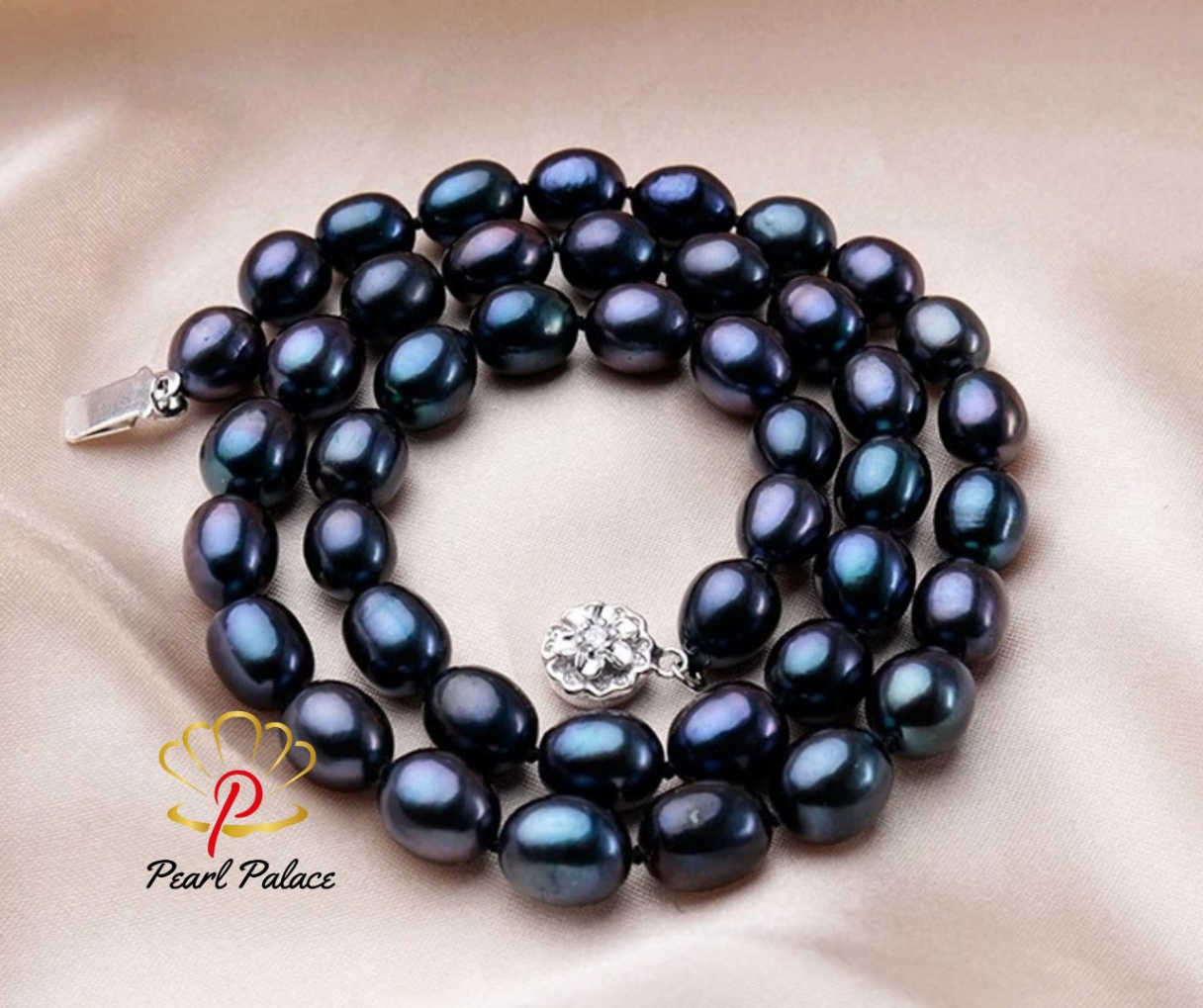 This elegant necklace features 8-9mm natural black freshwater pearls in a sleek rice shape, paired with a delicate 925 sterling silver flower buckle. Its sophisticated design makes it a perfect choice for parties or special occasions.