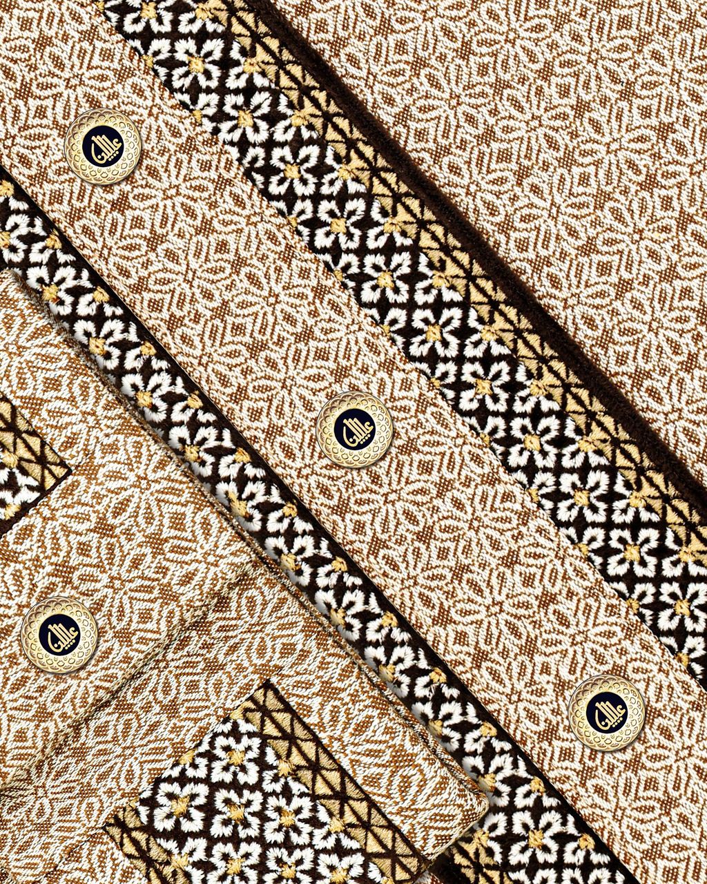 Crafted from Jacquard suiting fabric for sumptuous drapes and rich elegance, this masterpiece is adorned with stunning floral embroidery, adding a touch of refined sophistication—perfect for elevating any special occasion.