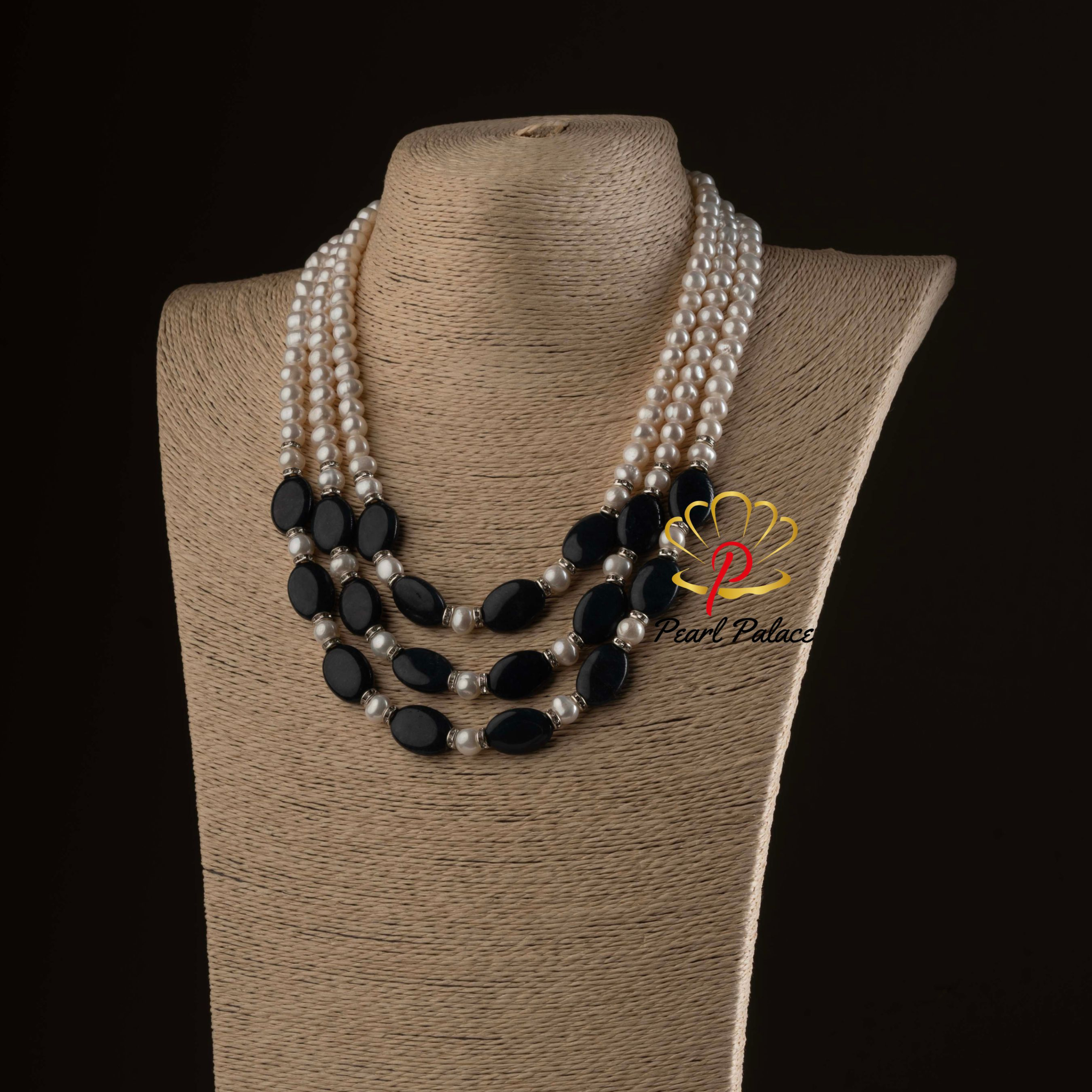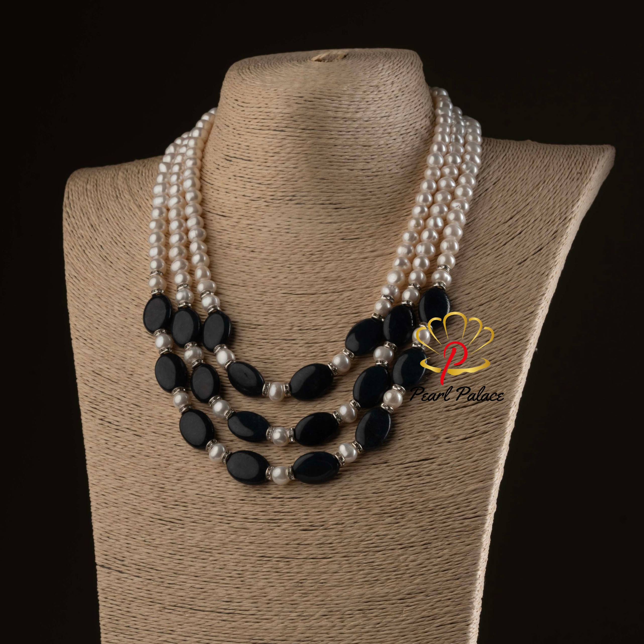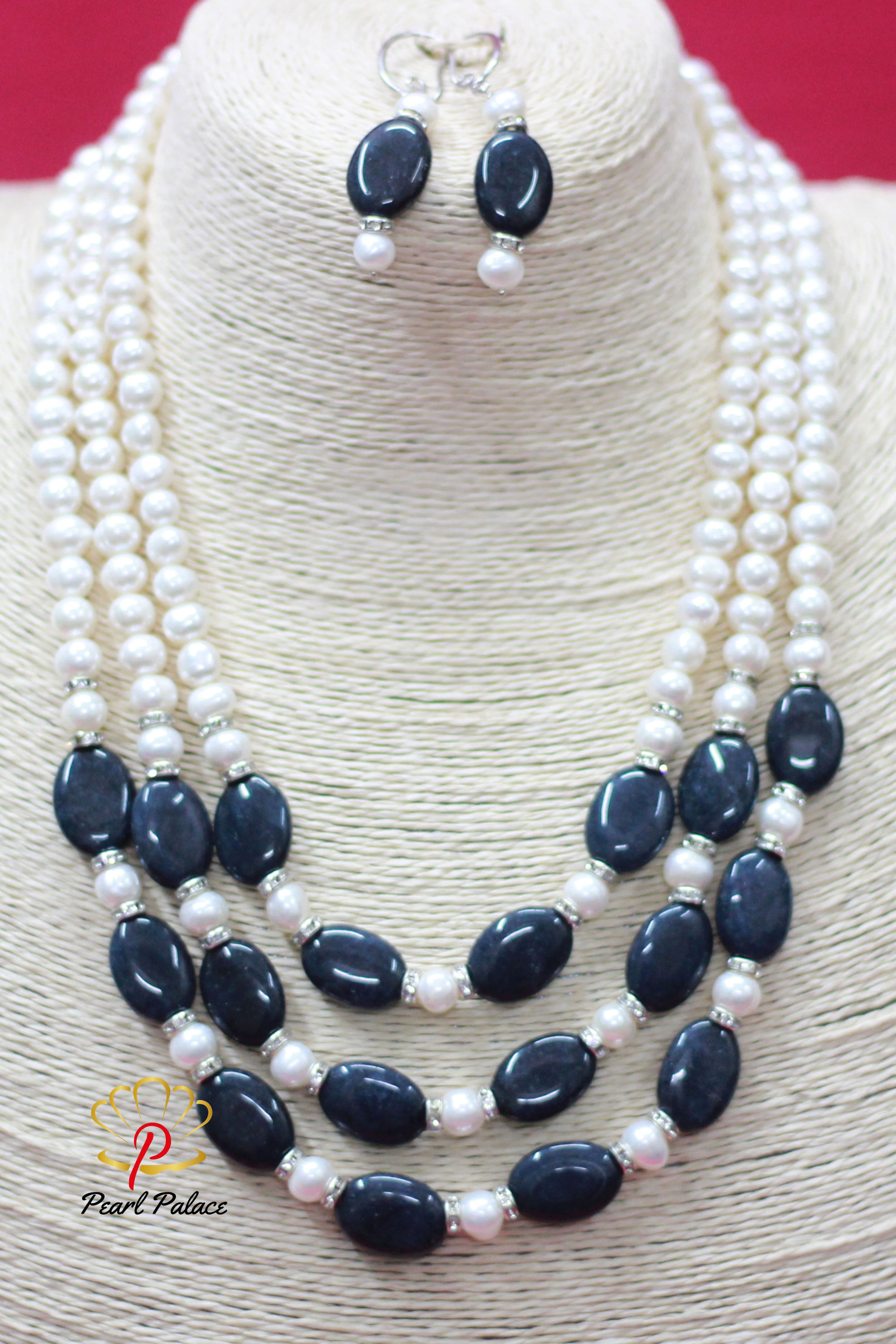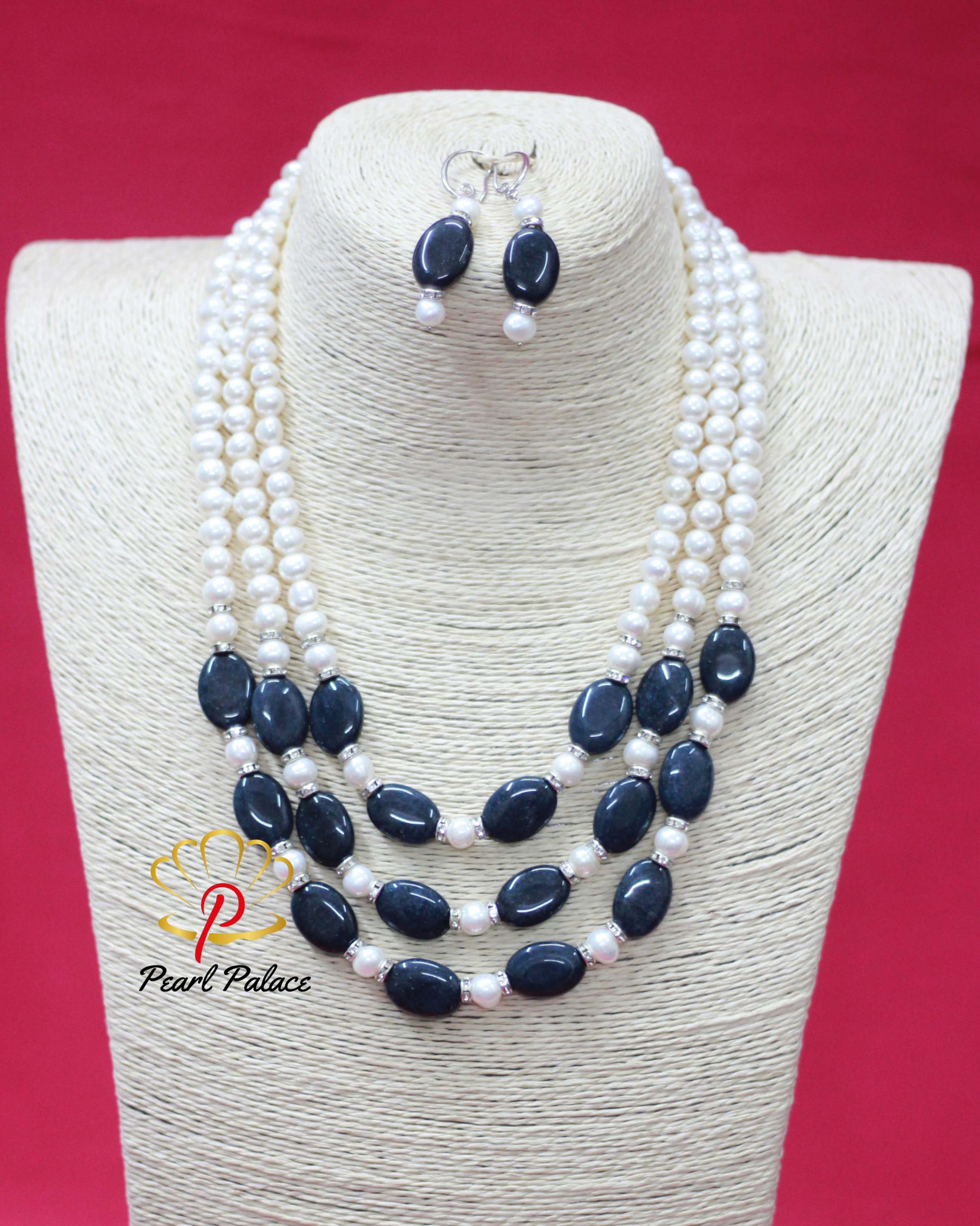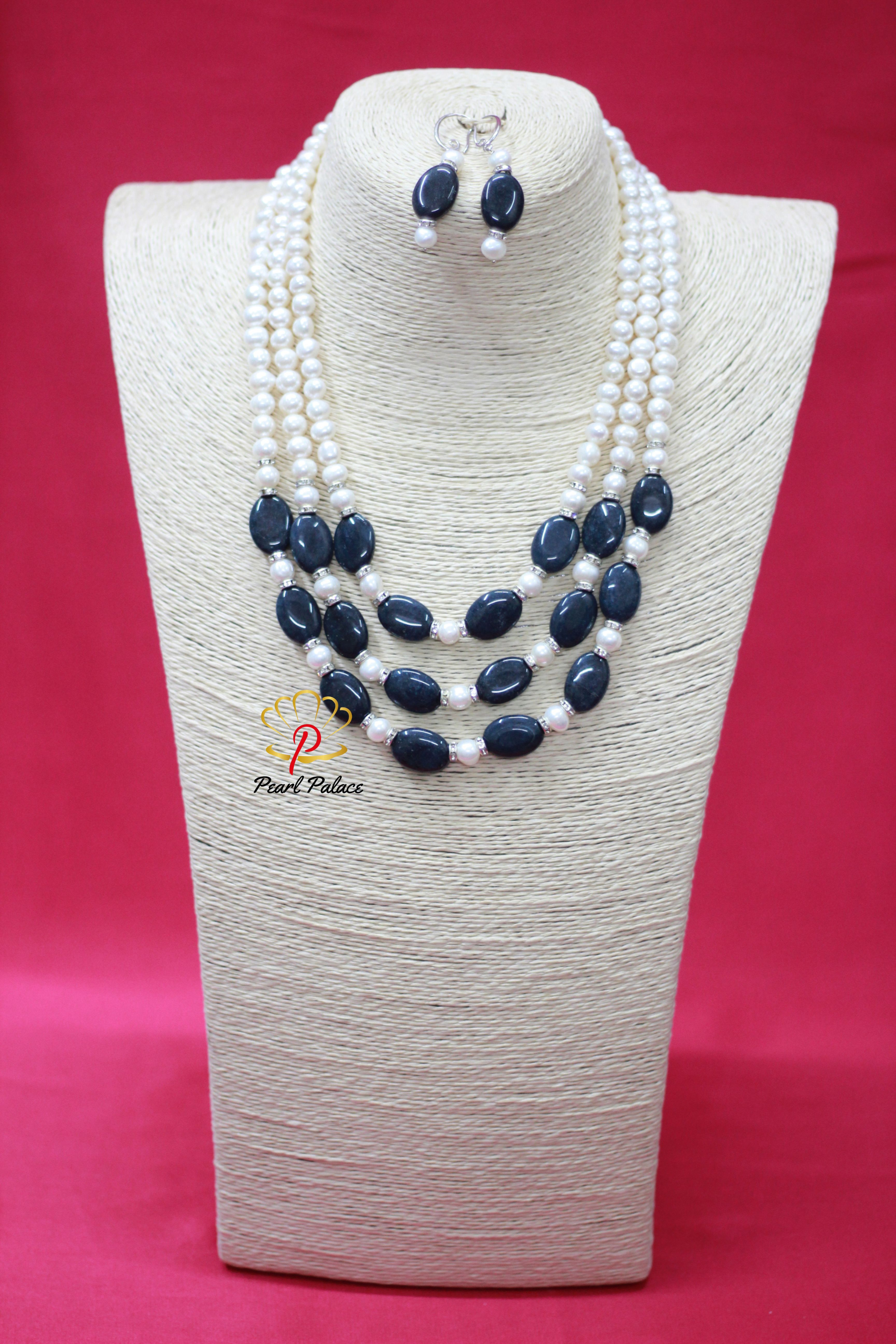 Ethereal Radiance: Freshwater Pearl & Sapphire Stone 3-Layer Necklace with Earrings