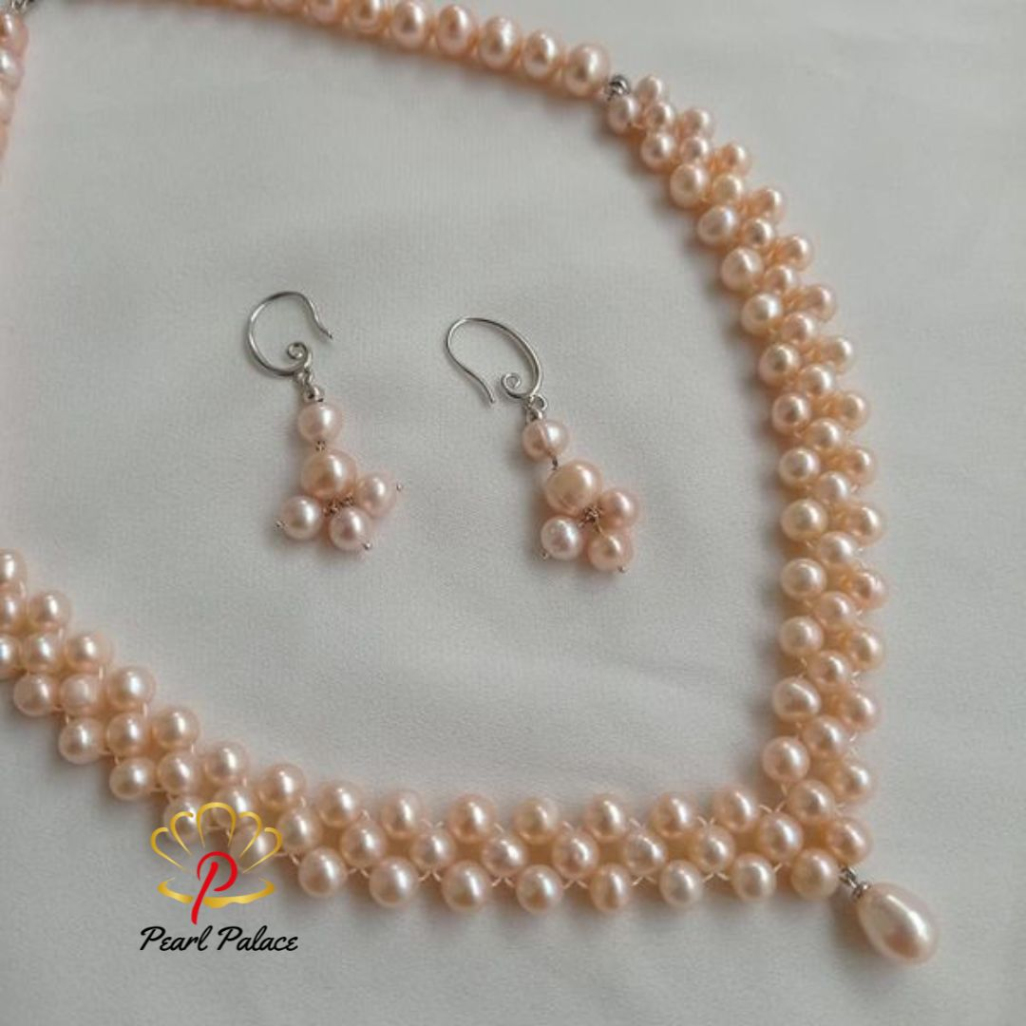 Short Description: A charming pink freshwater pearl necklace and earring set featuring a trellis-inspired design with delicate clusters and a single drop detail.