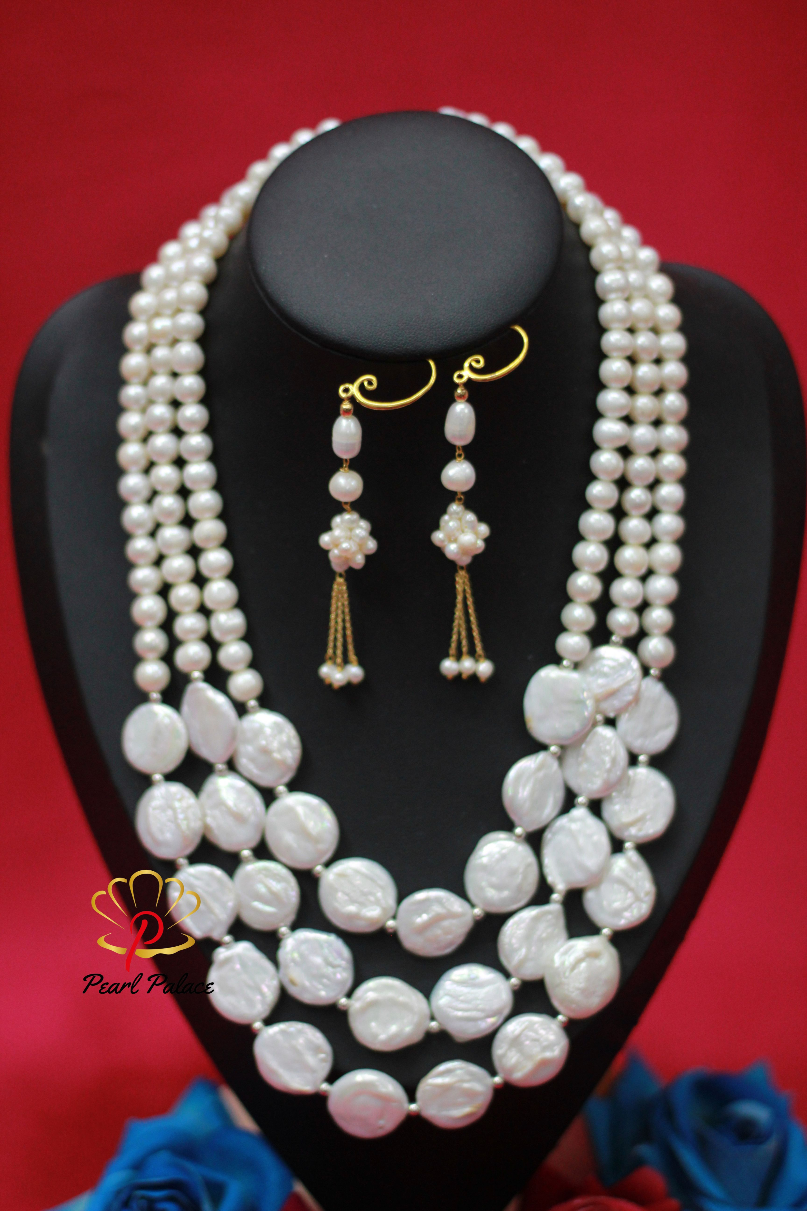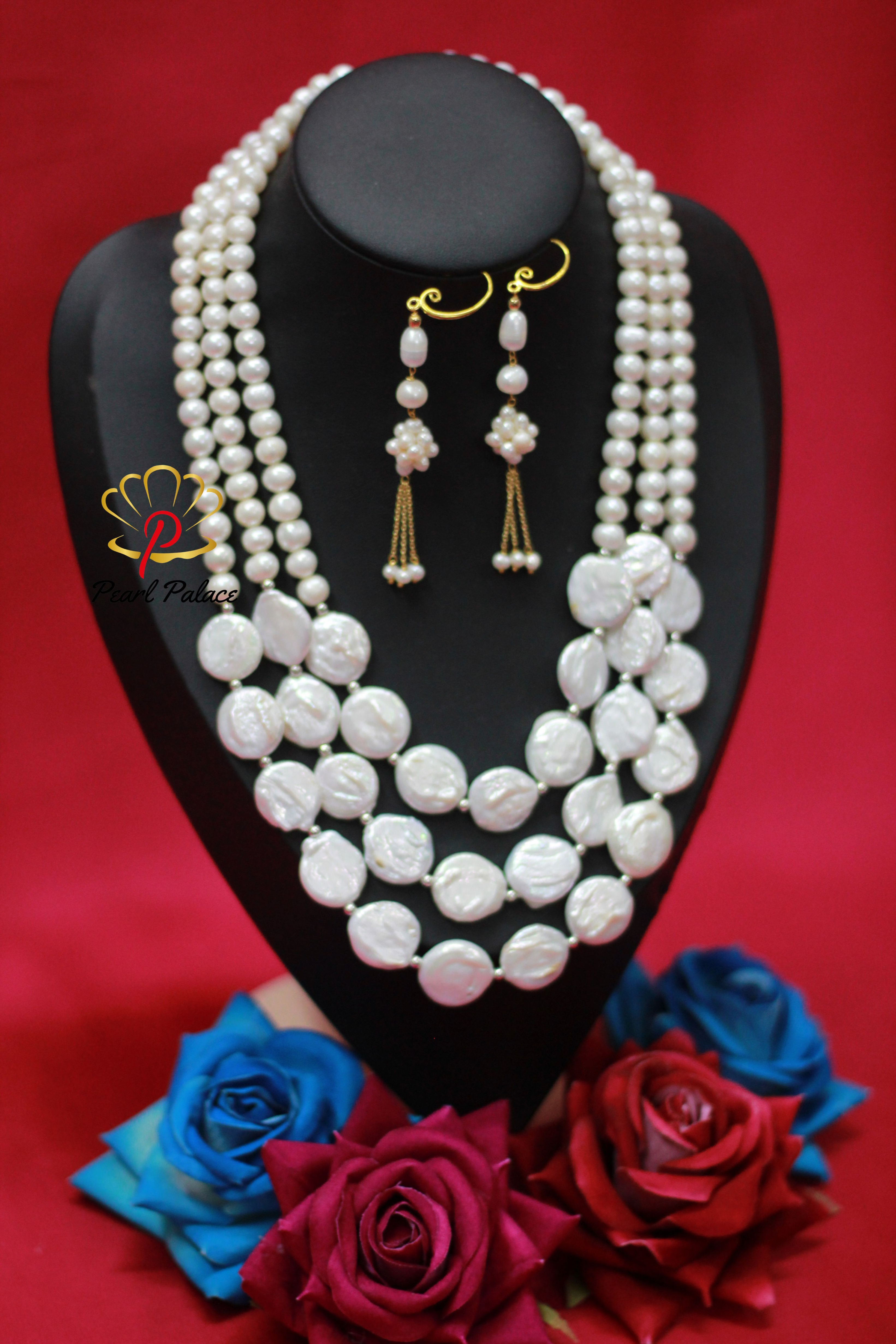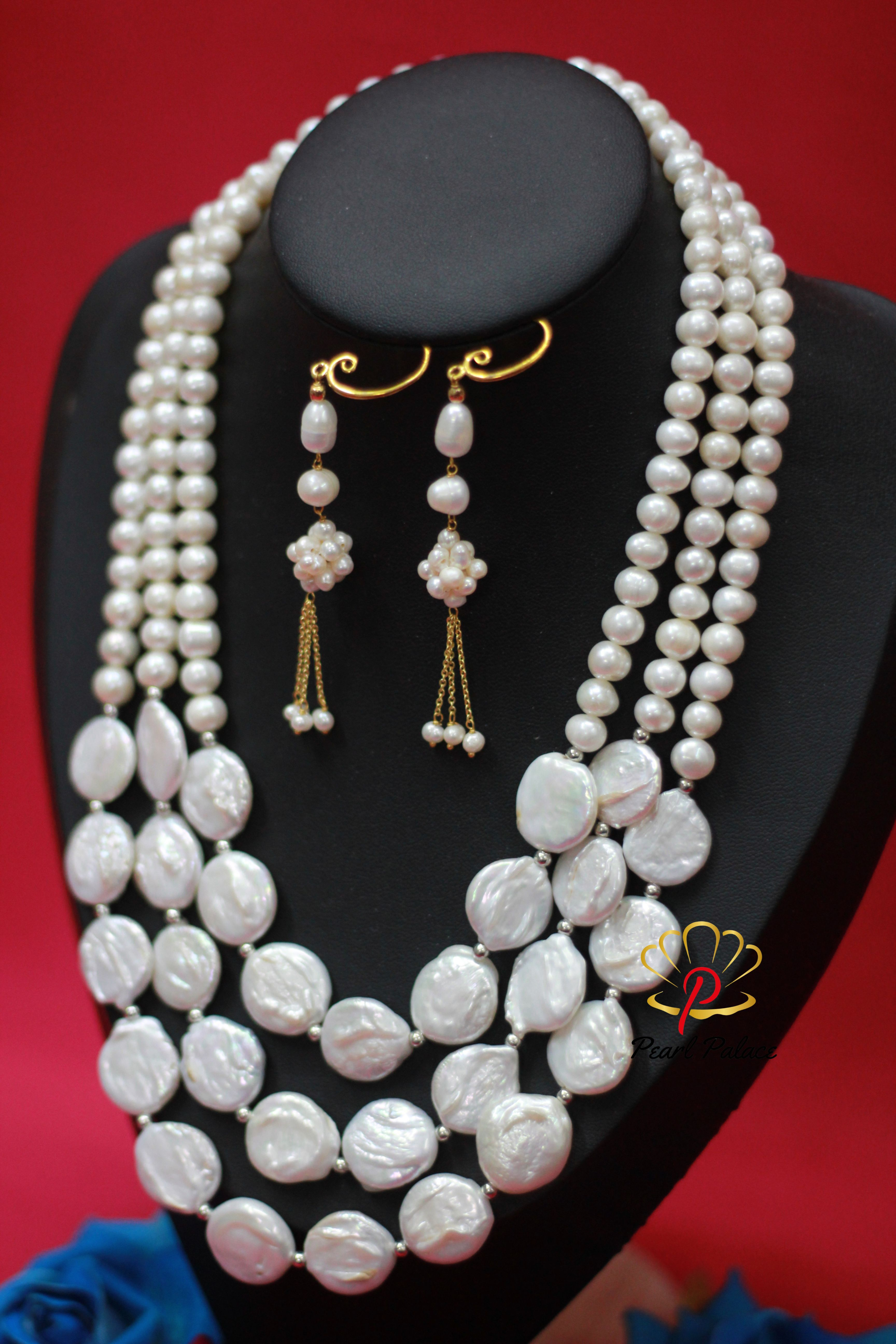 Product name: Coin Pearl & Freshwater Pearl Necklace with Earring Set – Layer 3 Pearl Size: 7-8 mm Pearl Grade: AAA Pearl Length 17-18 inch.