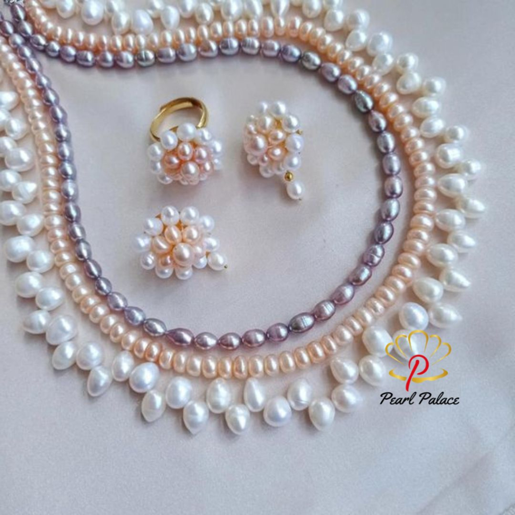 Short Description: A stunning freshwater pearl jewelry set featuring three distinct necklace strands in varying pearl colors and textures, paired with matching cluster earrings and a ring.