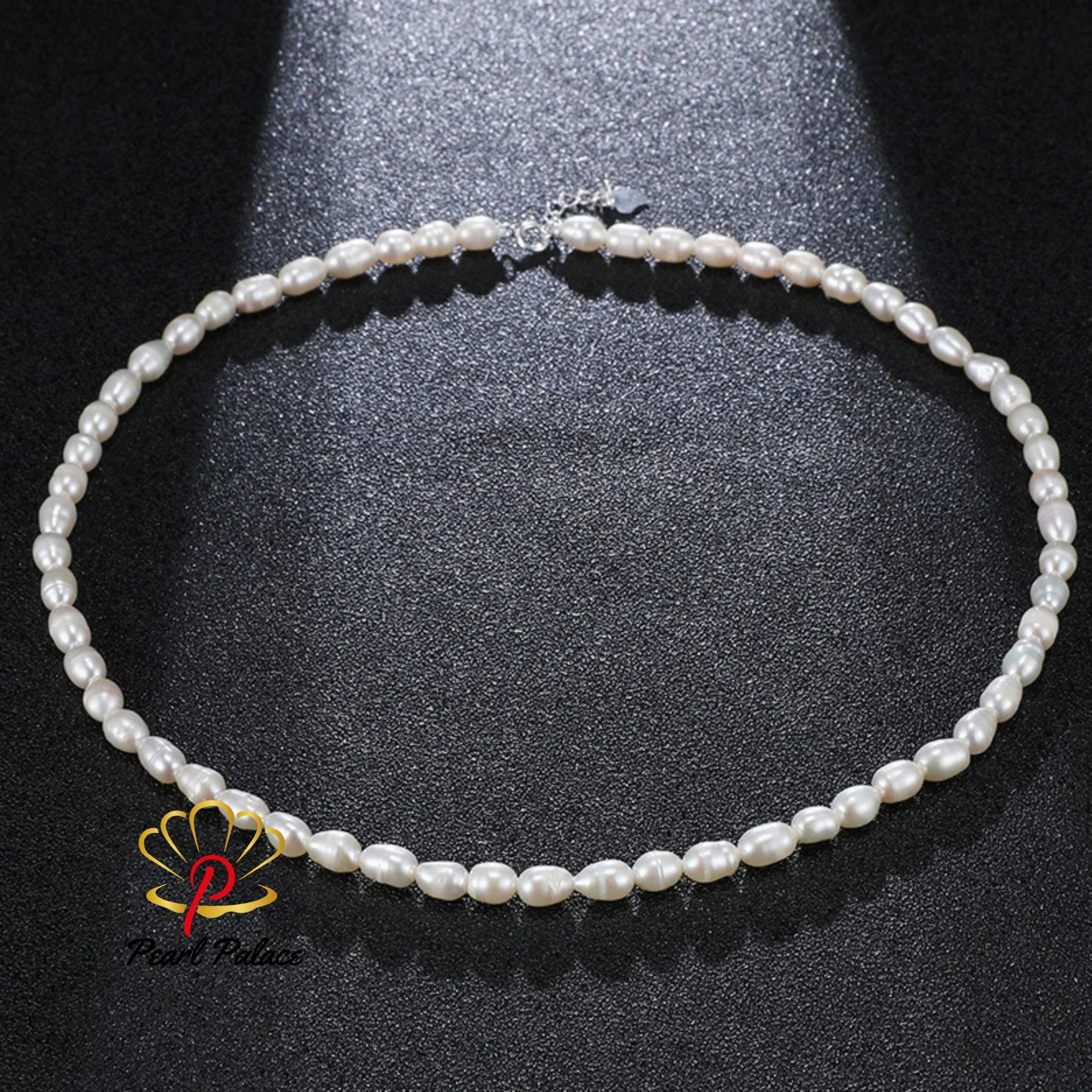 This delicate necklace features small 4.5-5.5mm natural freshwater pearls in a sleek rice shape, paired with 925 sterling silver for a minimalist and elegant design. Its subtle size and timeless style make it a perfect choice for any occasion.